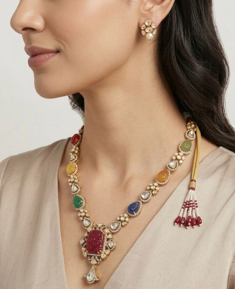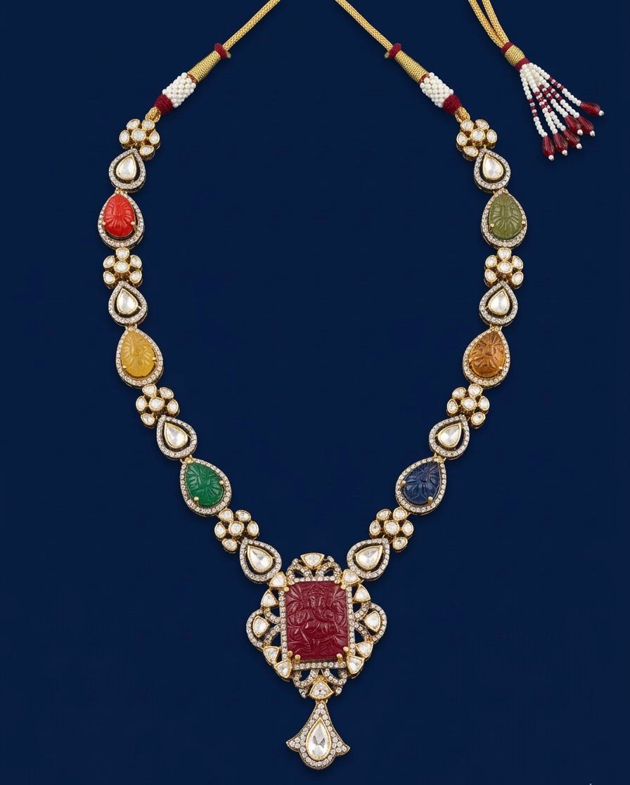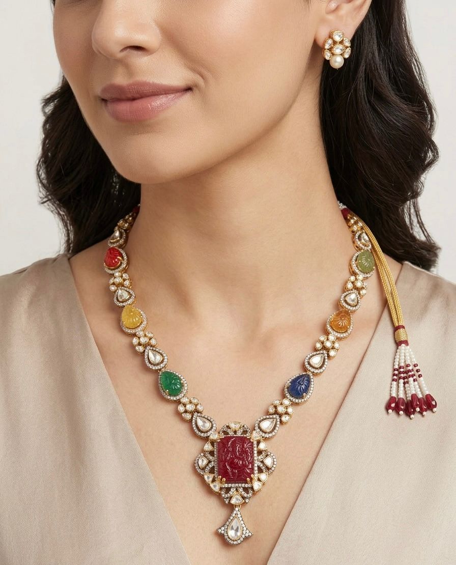 An elegant silver necklace adorned with sparkling moissanite and CZ stones, beautifully highlighted with multicolour carved stones that add a vibrant and artistic touch. The necklace features a striking carved centerpiece pendant surrounded by shimmering stones, creating a perfect blend of tradition and contemporary design. Ideal for festive occasions, weddings, and statement styling, this piece adds colour, brilliance, and sophistication to any look.