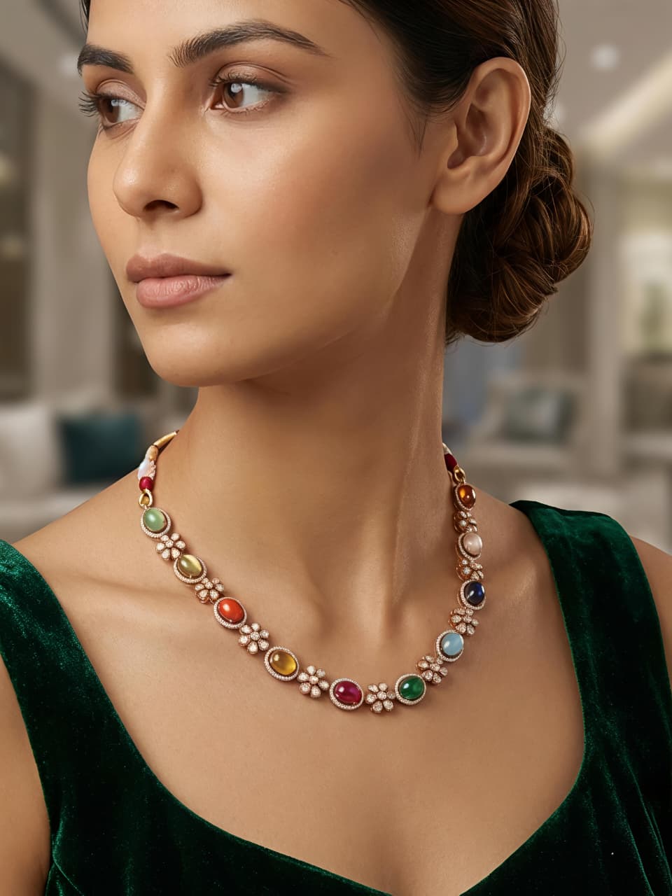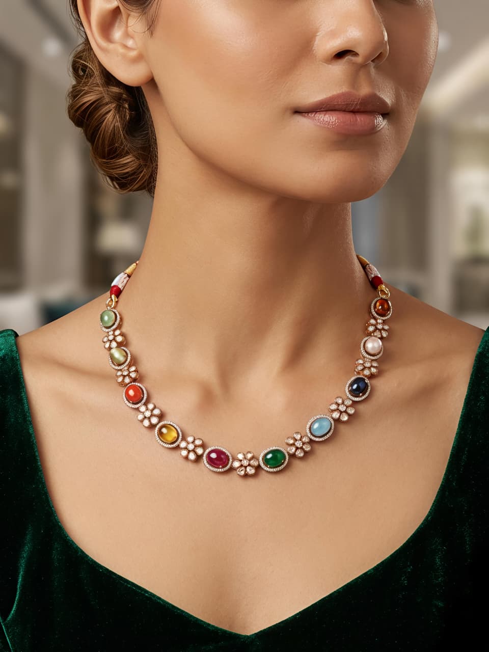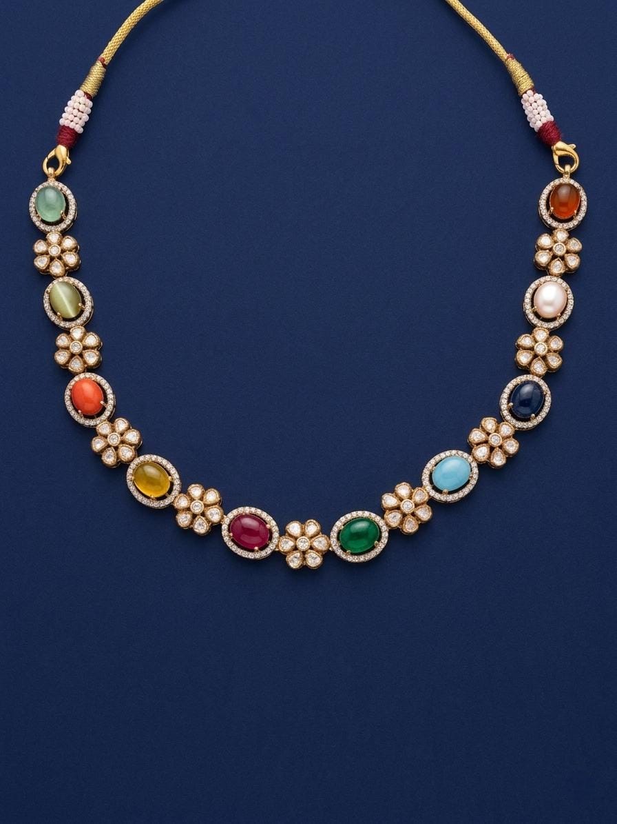 Be the first to review “Navaratna 92.5 Sterling Silver Necklace with Moissanite, CZ & Colourstone Embellishments”