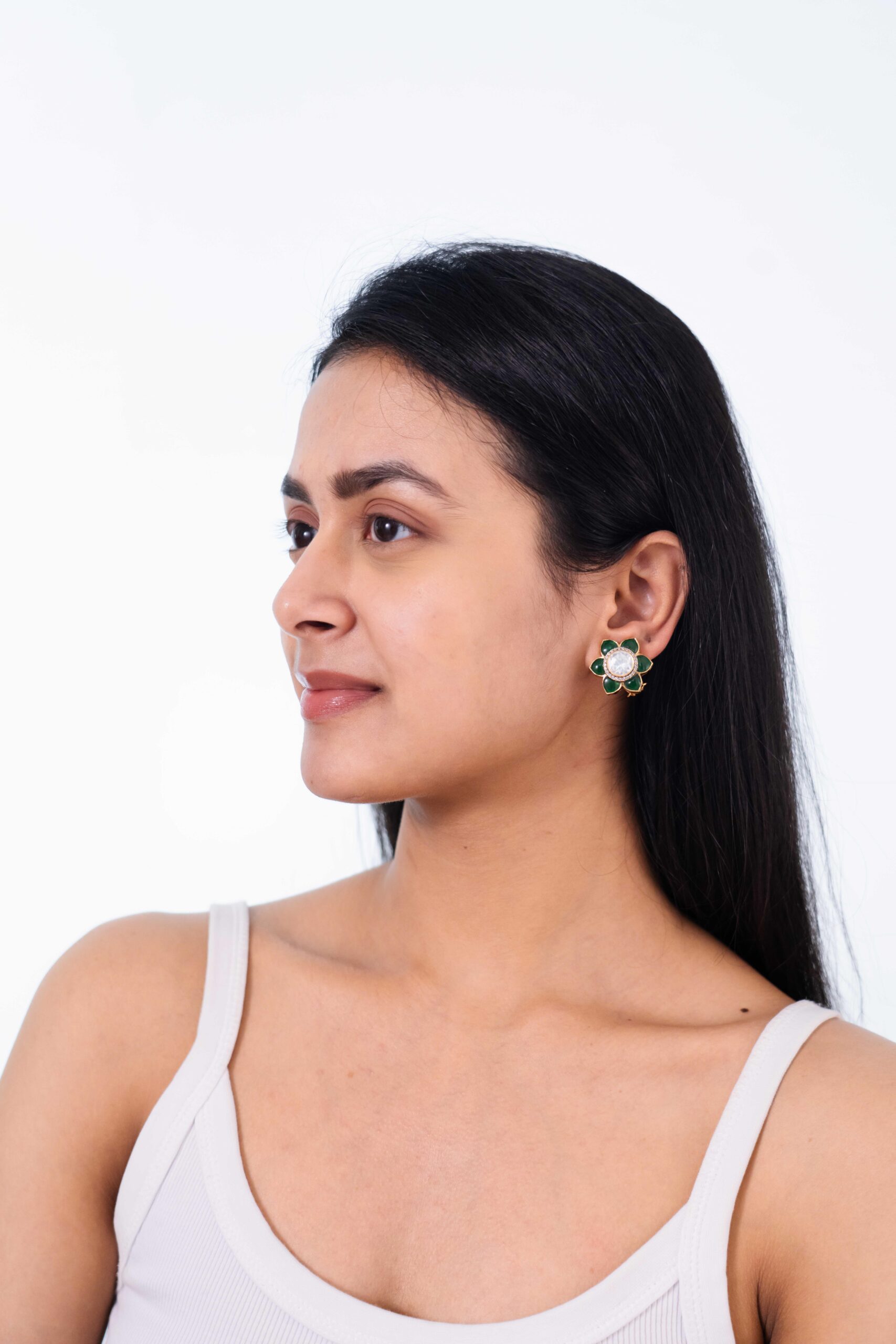 These beautifully detailed stud earrings feature a floral design with rich green emerald petals encircling a luminous, faceted mozonite.