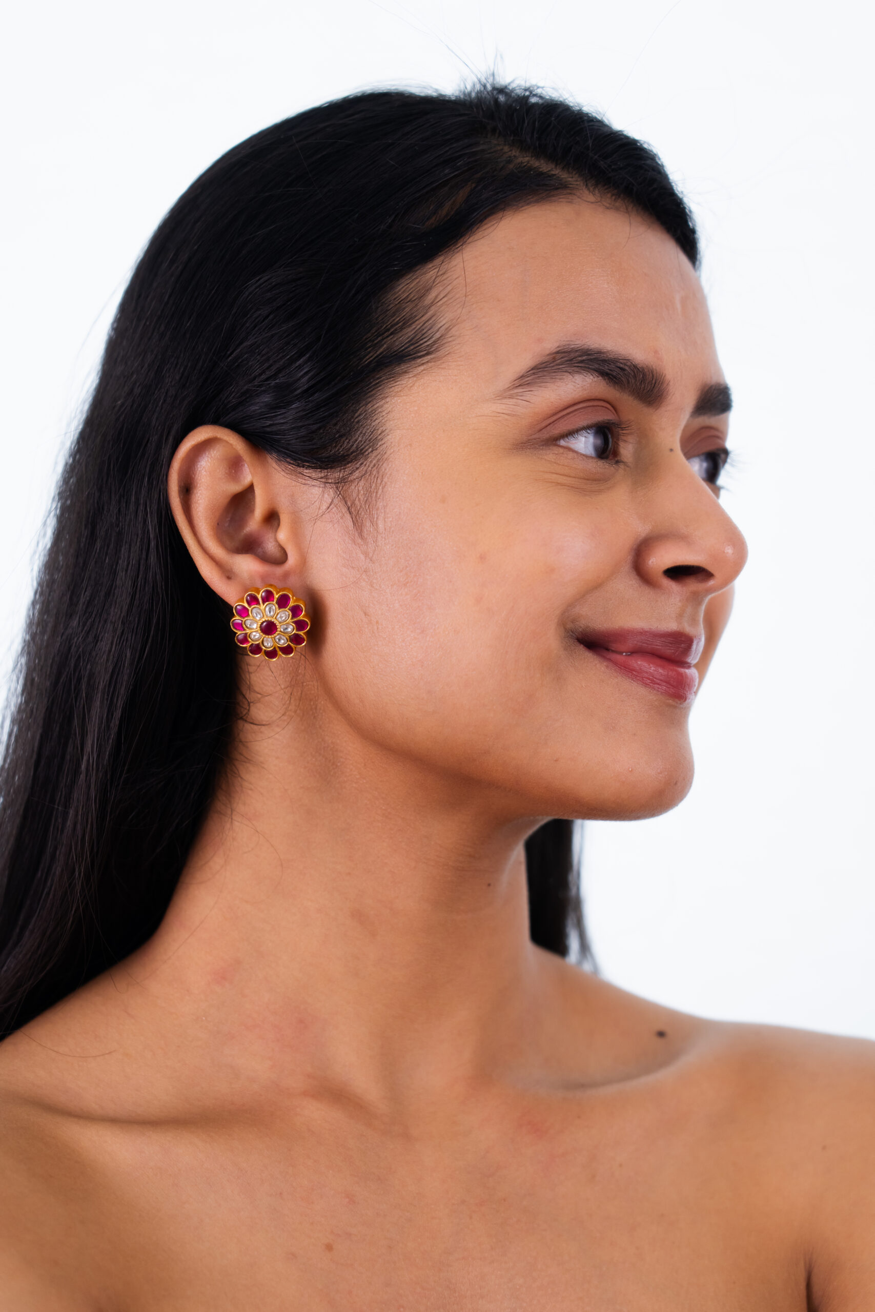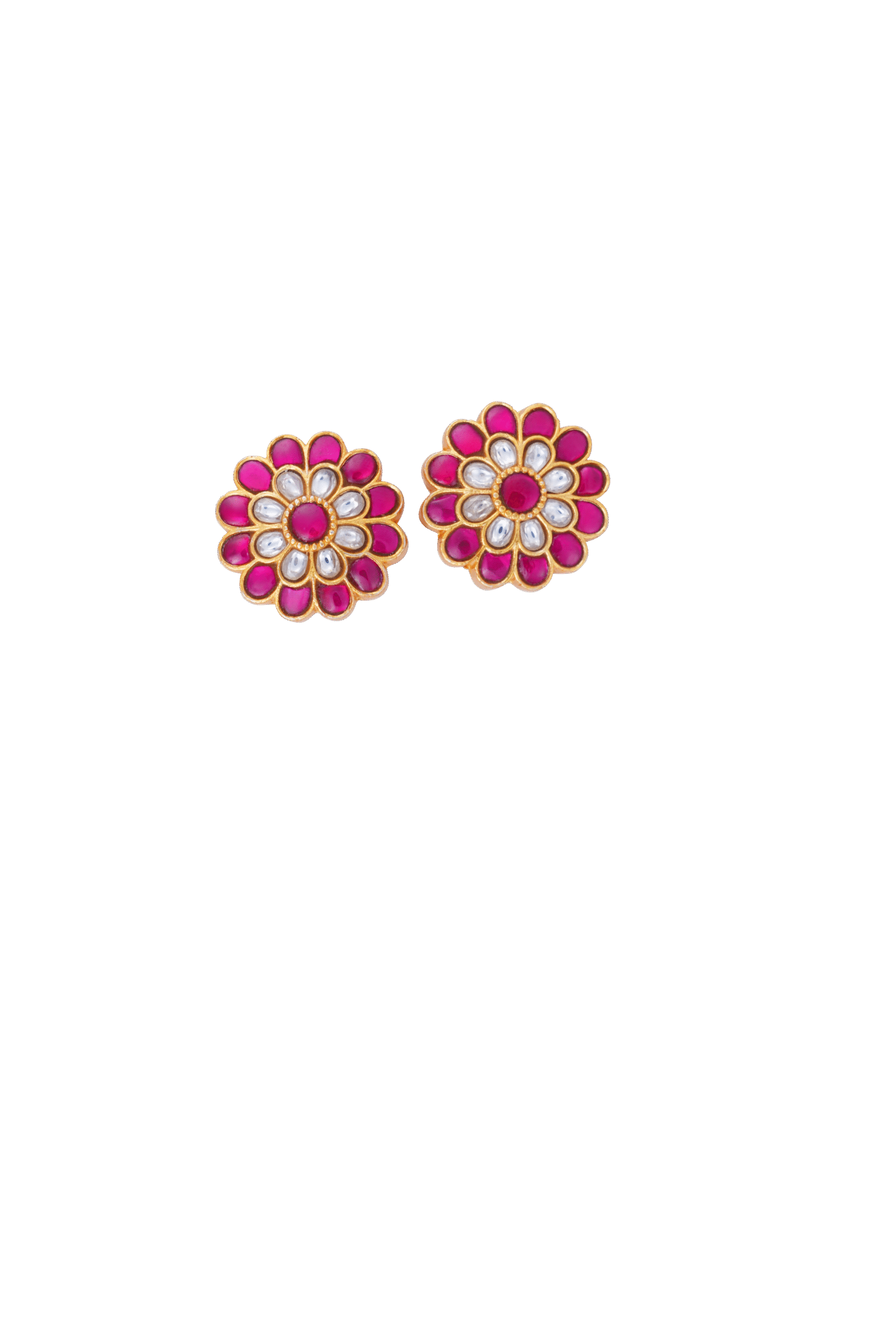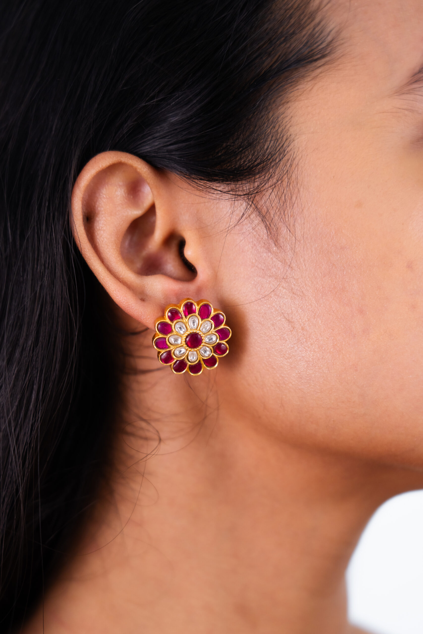 These stud earrings highlight a radiant center surrounded by vibrant ruby petals, each meticulously set in Kundan work, creating a focal point of beauty for your ensemble.