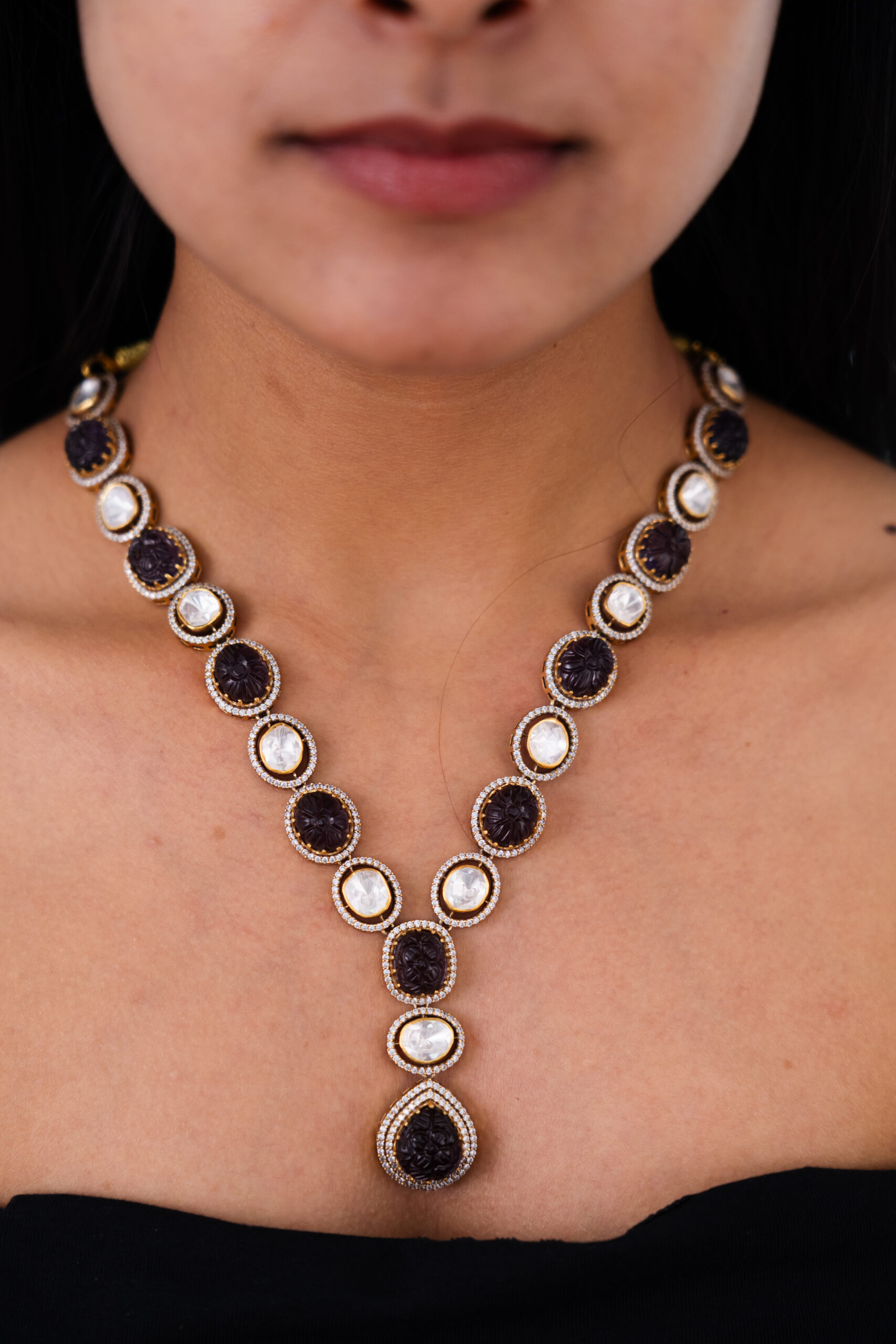 This necklace highlights the prominent carved ruby pendant and alternating ruby and pearl links, complemented by the delicate sparkle of Swarovski crystals, creating a focal point of unique gemstone variety