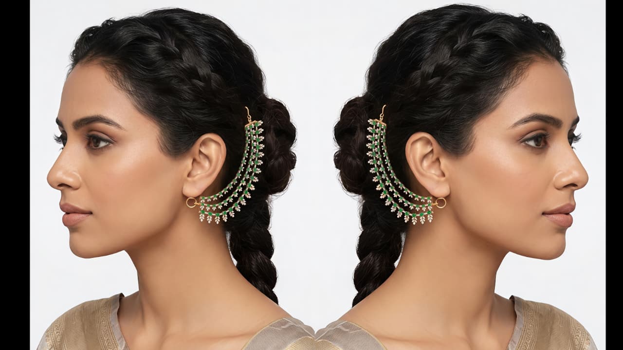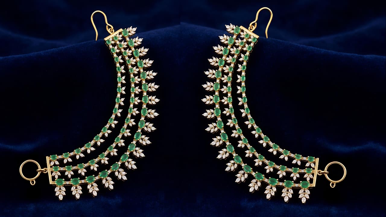 Elevate your bridal or festive ensemble with this exquisite Triple-Strand Ear-Chain (Sahare). Expertly handcrafted in 925 Sterling Silver, this piece features three cascading tiers of brilliant Moissanite and high-grade CZ stones, meticulously set to capture the light from every angle.The design is accented with rich, oval-cut Emerald-green color stones, arranged in a delicate floral-leaf motif that exudes timeless royalty. Designed for both comfort and glamour, it features a secure hook and loop closure to effortlessly support heavy earrings or be worn as a statement hair accessory.