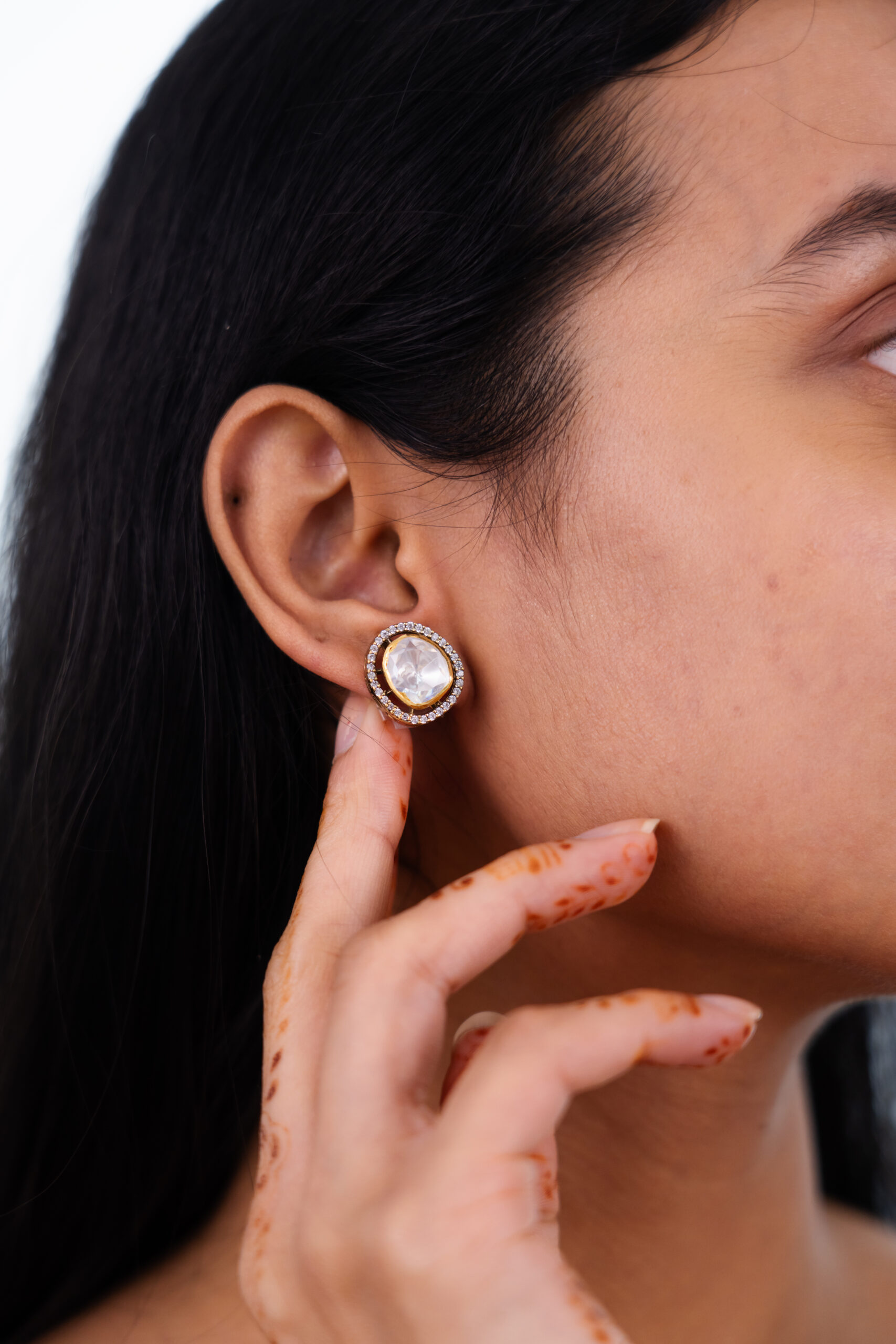 Classic stud earrings featuring a brilliant round moissanite at the center, encircled by a delicate halo of sparkling Swarovski crystals. A timeless design with exceptional shine