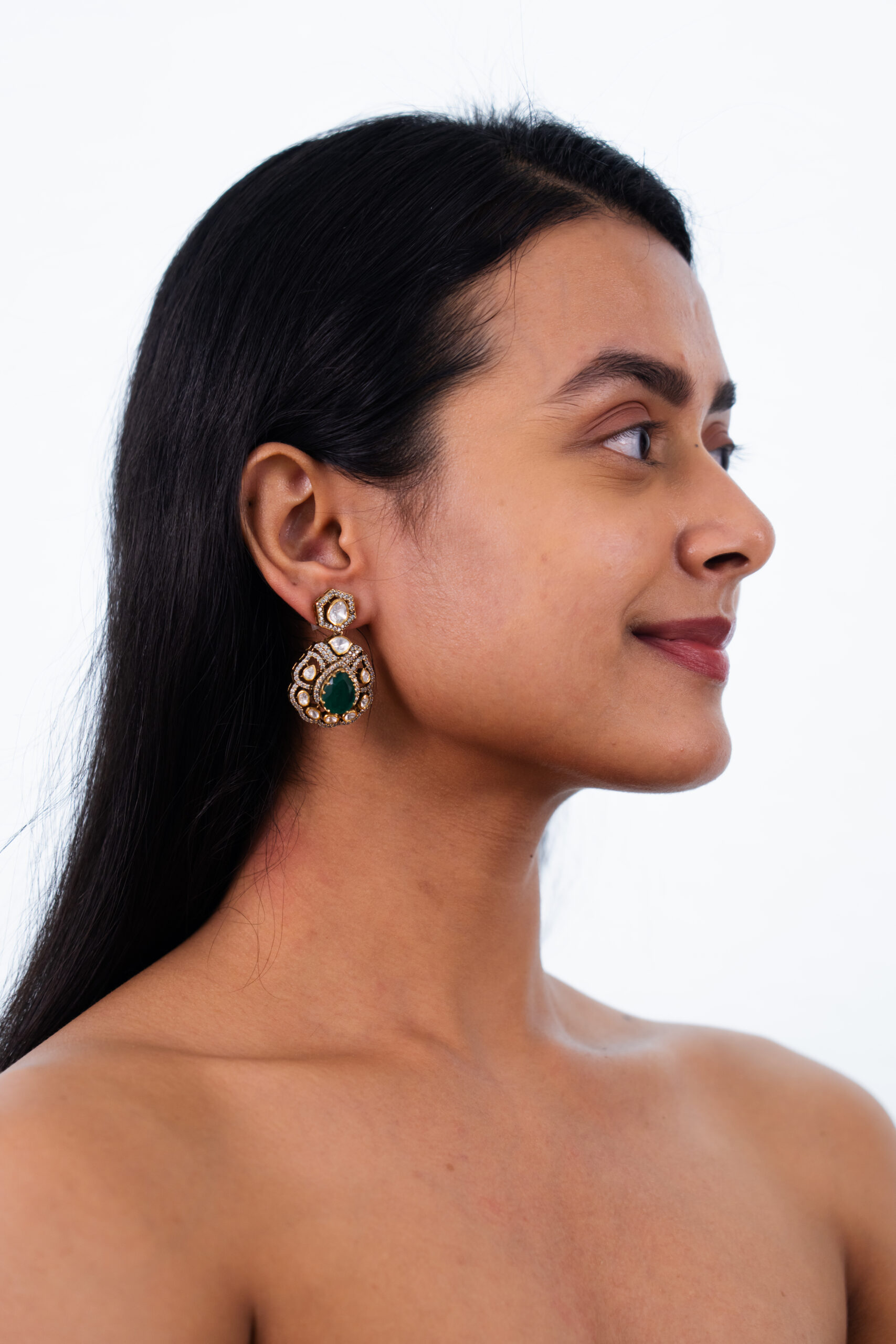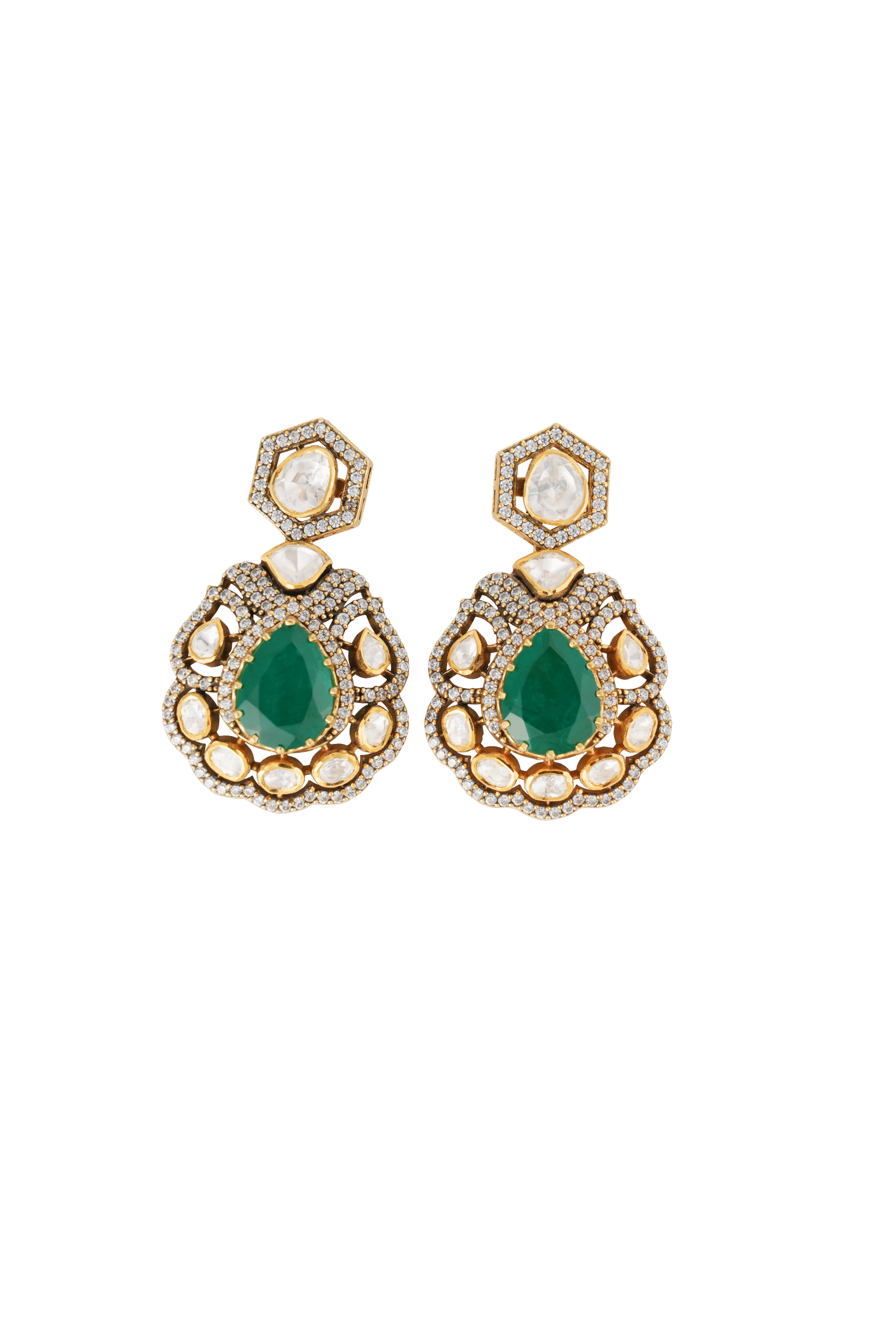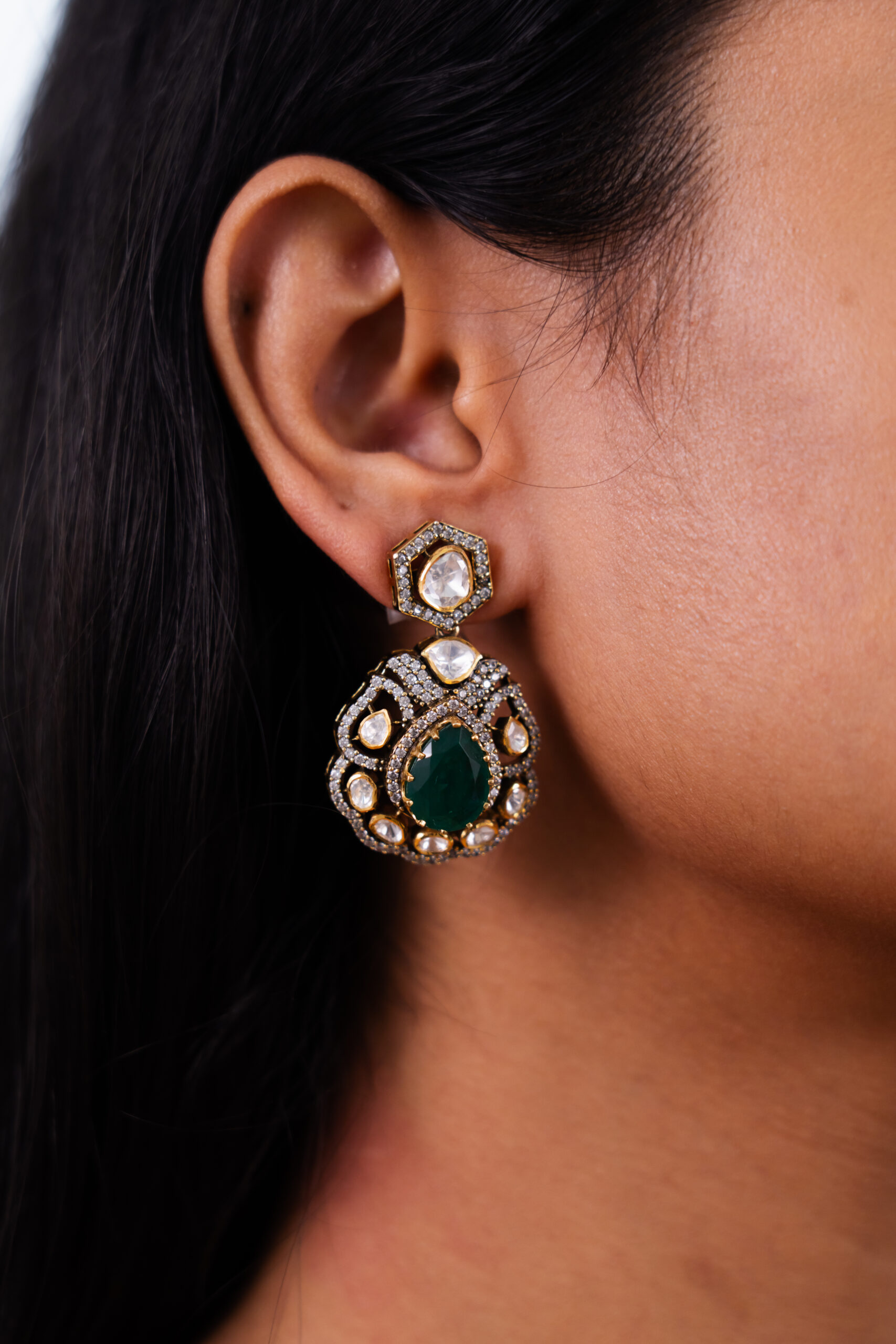 Make a statement with these regal emerald polki earrings. A striking oval-cut emerald sits at the heart of each earring, surrounded by a meticulous arrangement of mozonites, set in intricate gold craftsmanship. The hexagonal mozonites along with swarovskis adds a unique architectural touch, making these earrings a perfect blend of tradition and modern elegance.