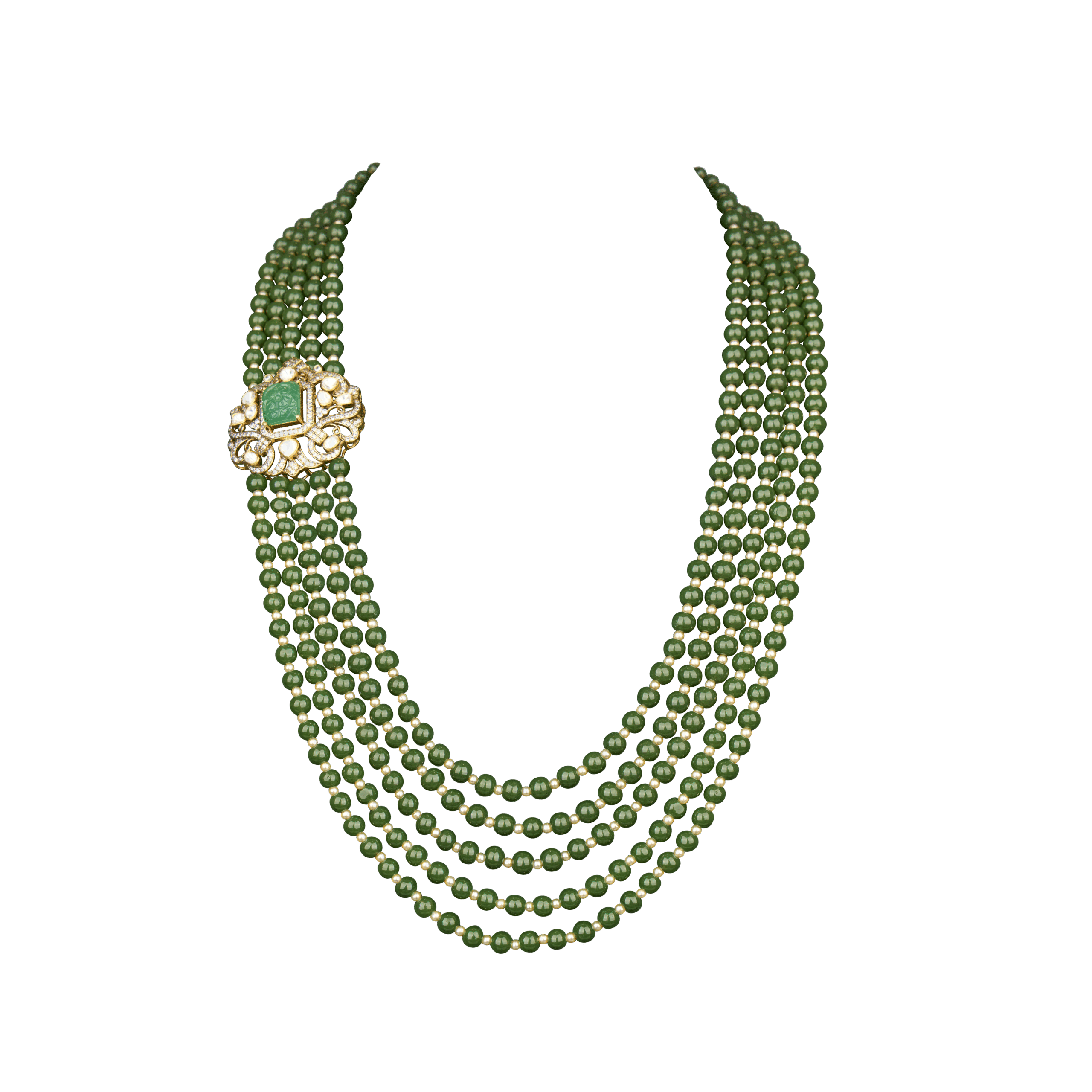 An elegant multi-strand green bead necklace featuring a beautifully detailed heritage-style clasp with stone accents, perfect for regal ethnic styling.