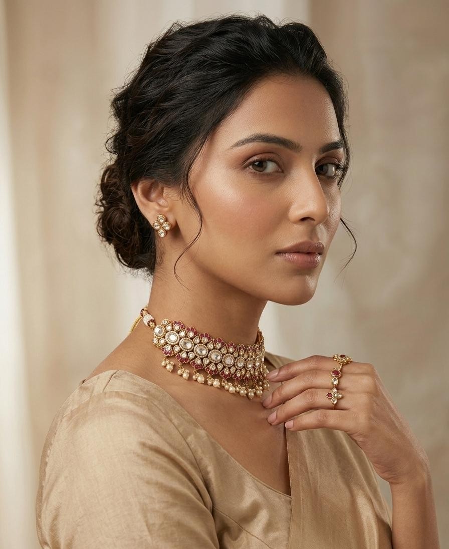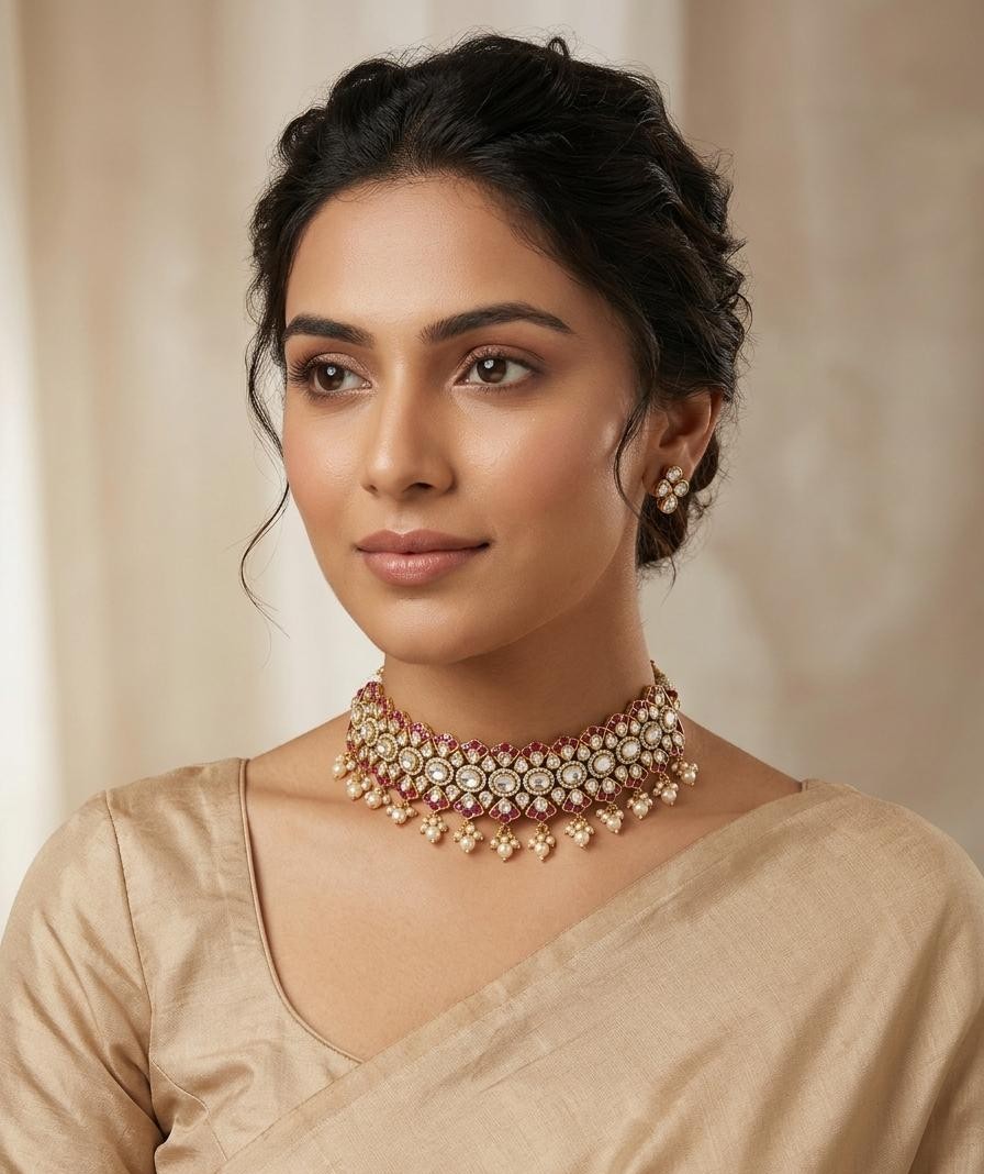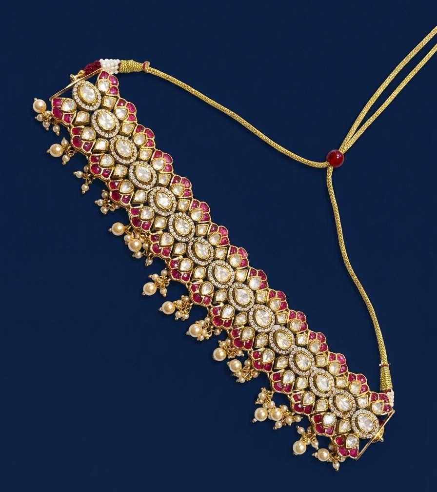 A beautifully crafted statement choker featuring sparkling moissanite and CZ stones arranged in an intricate floral pattern with rich ruby color stones. Finished with delicate pearl drops, this elegant design adds a royal touch to bridal and festive looks.