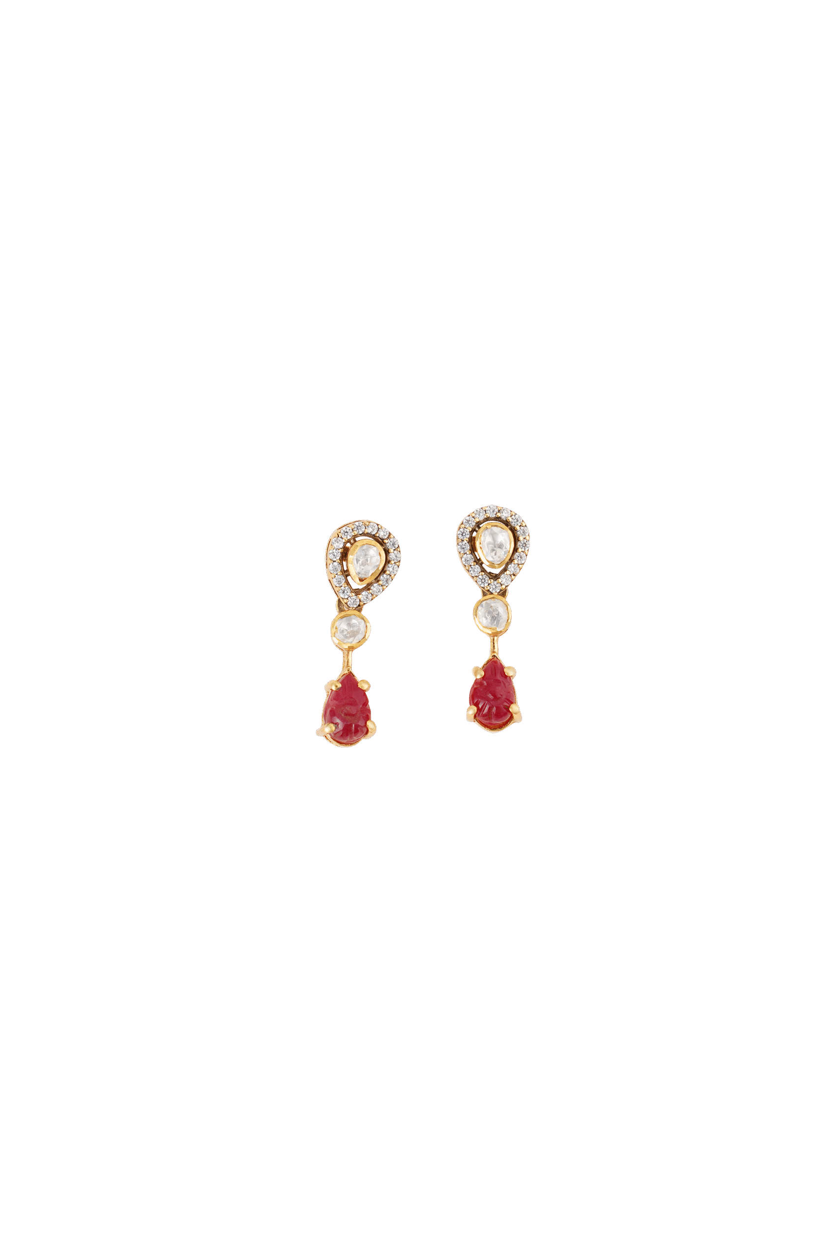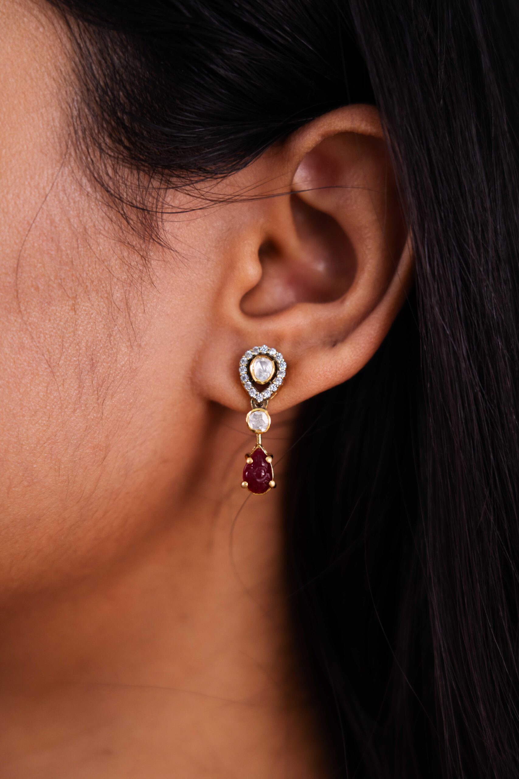 Elegant drop earrings featuring a vibrant ruby followed by a uniquely shaped mozonites, both delicately framed with sparkling accents in a sleek, linear design. A sophisticated touch for your style.