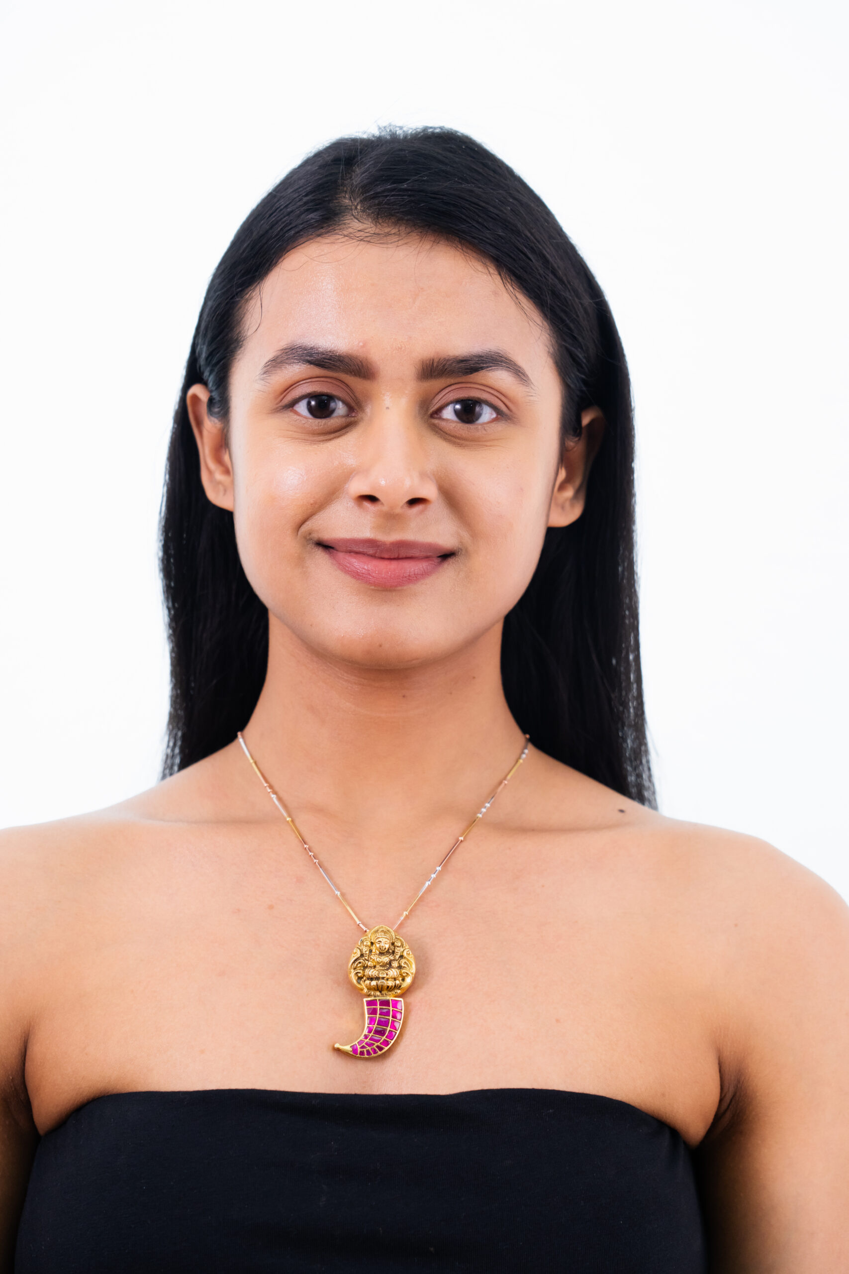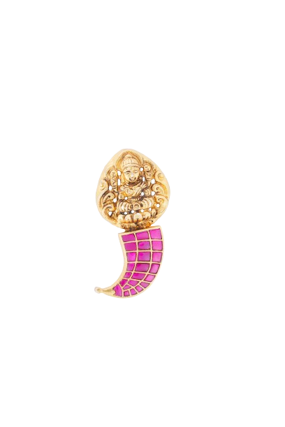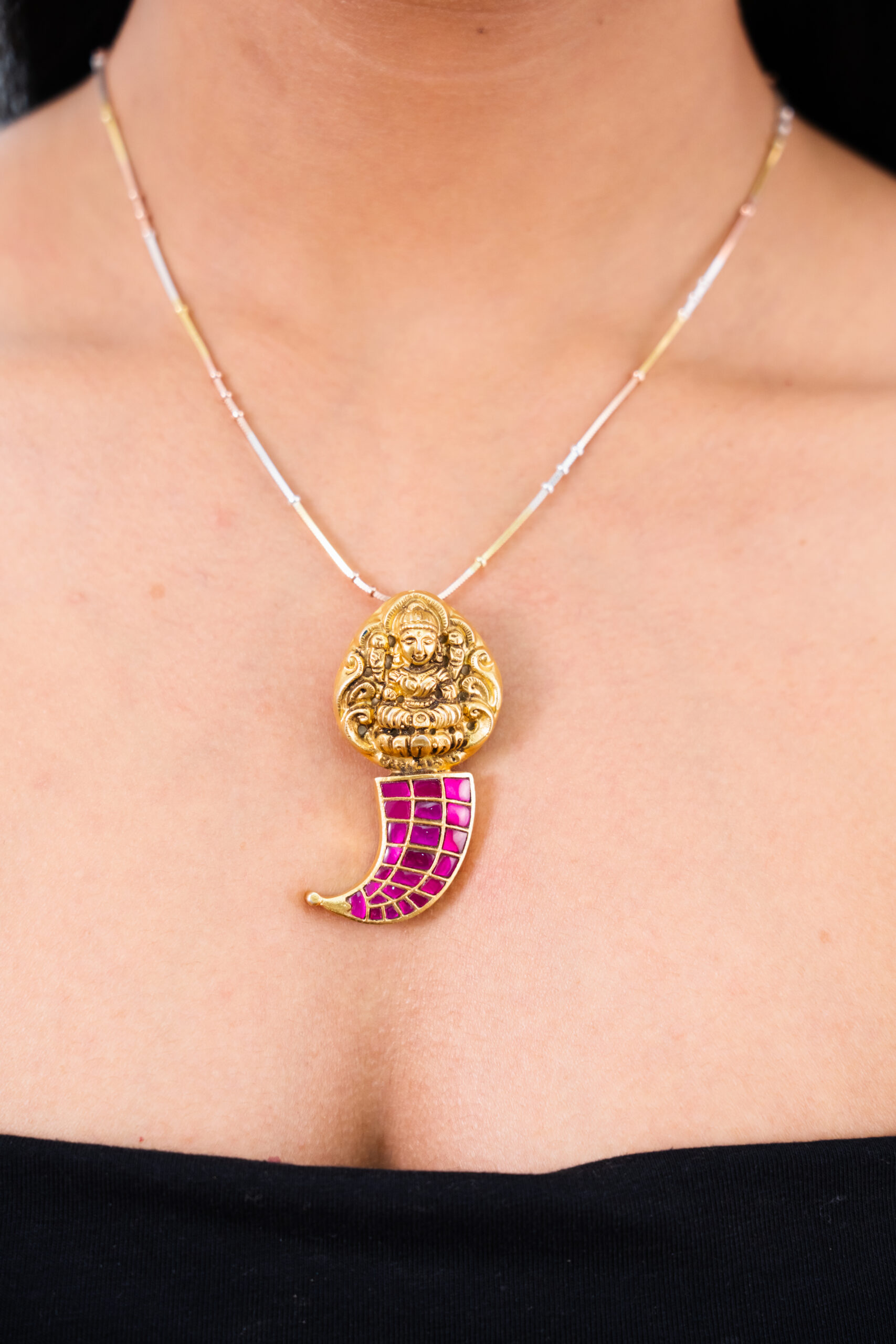 “Sanskriti” (culture) is celebrated in this Kundan locket, showcasing a ruby-inlaid crescent and a detailed deity motif, making a bold cultural statement