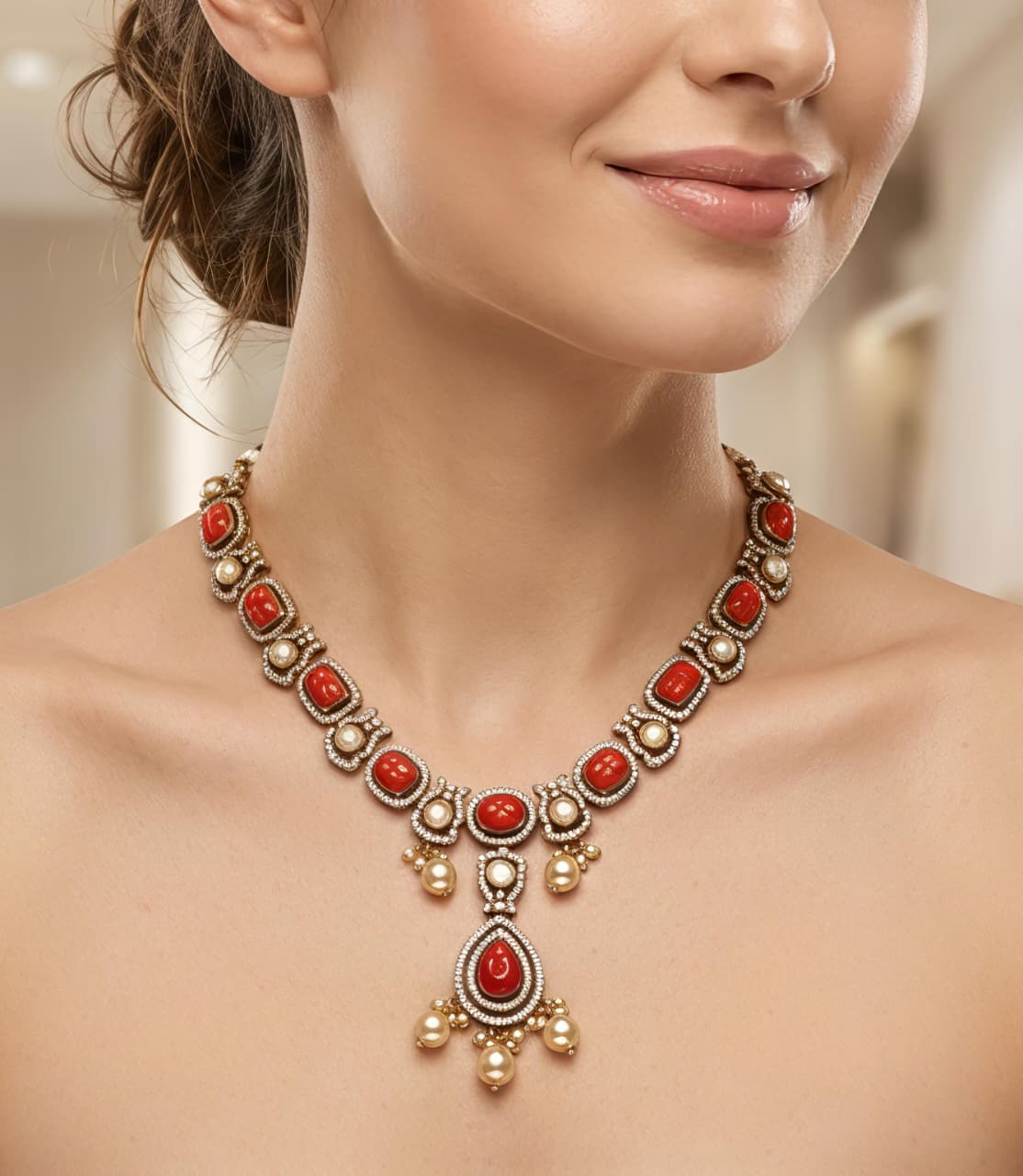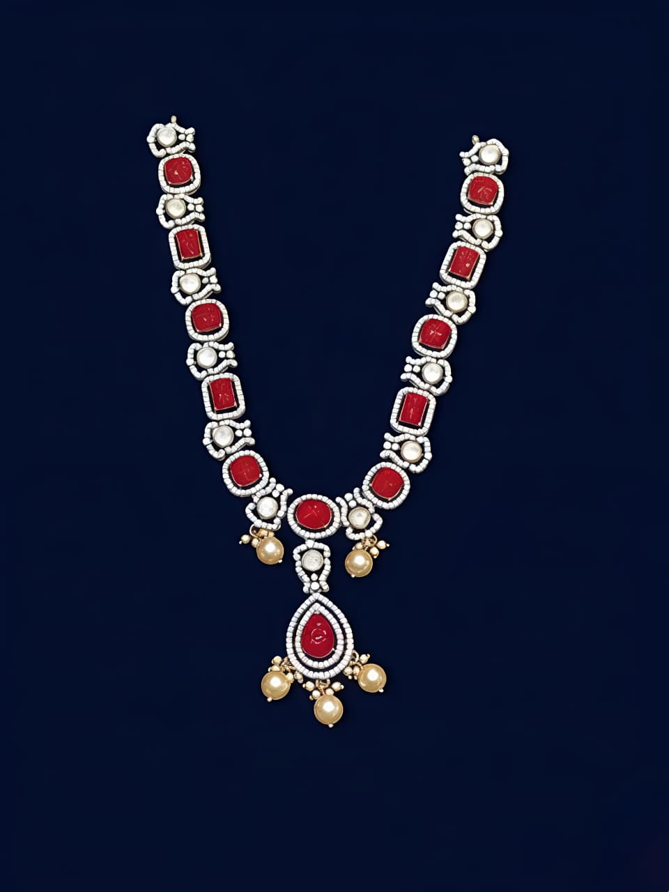 Beautiful silver koral necklace adorned with sparkling moissanite, CZ, and rich red colourstones. Designed with a striking pendant and pearl drops, perfect for bridal, festive, and statement wear.