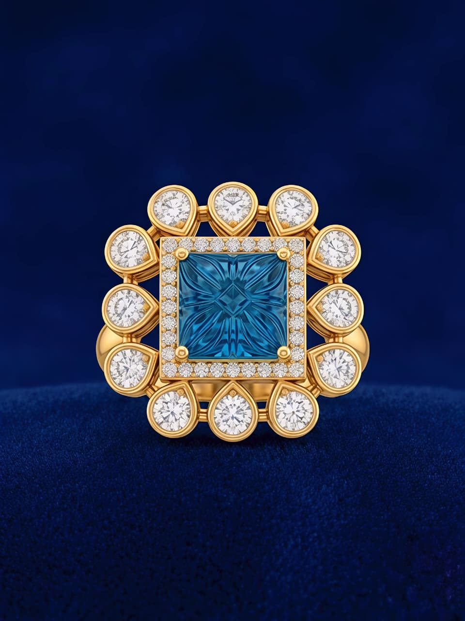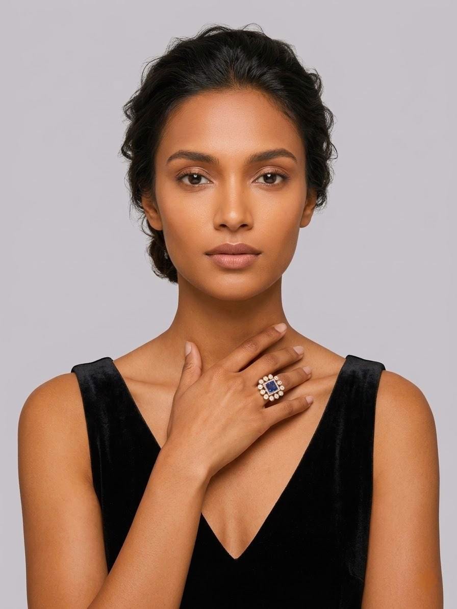 Stylish silver ring featuring a bold square-cut blue colorstone center, surrounded by sparkling moissanite and CZ accents in a unique halo design for a standout look.