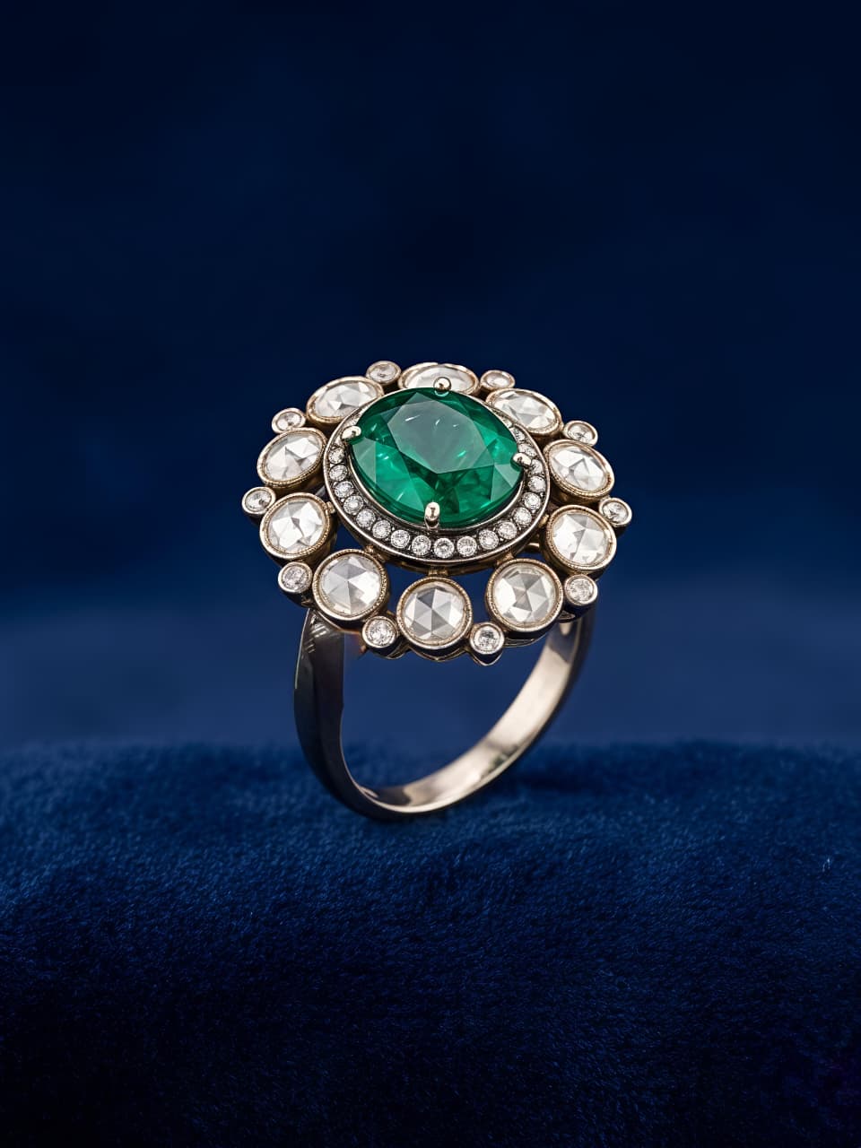 Elegant silver ring featuring a vibrant green center stone, surrounded by sparkling moissanite and CZ in a vintage-inspired design. Perfect for special occasions.